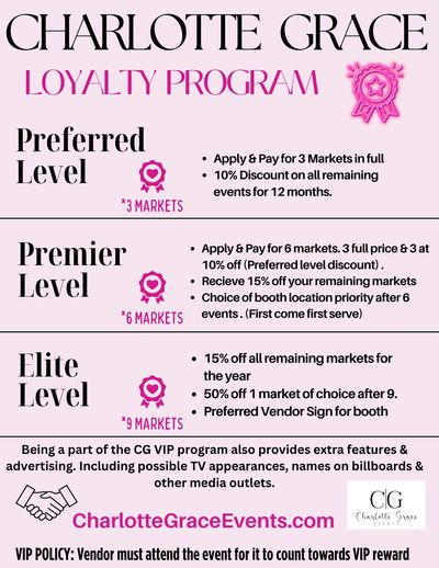 At Charlotte Grace Events, we are passionate about our vendors knowing that we care. We hope that you will enjoy our loyalty program that was developed to help off set some of the fee when signing up for multiple events. We hope you enjoy the perks of being a part of the Charlotte Grace Events Family!